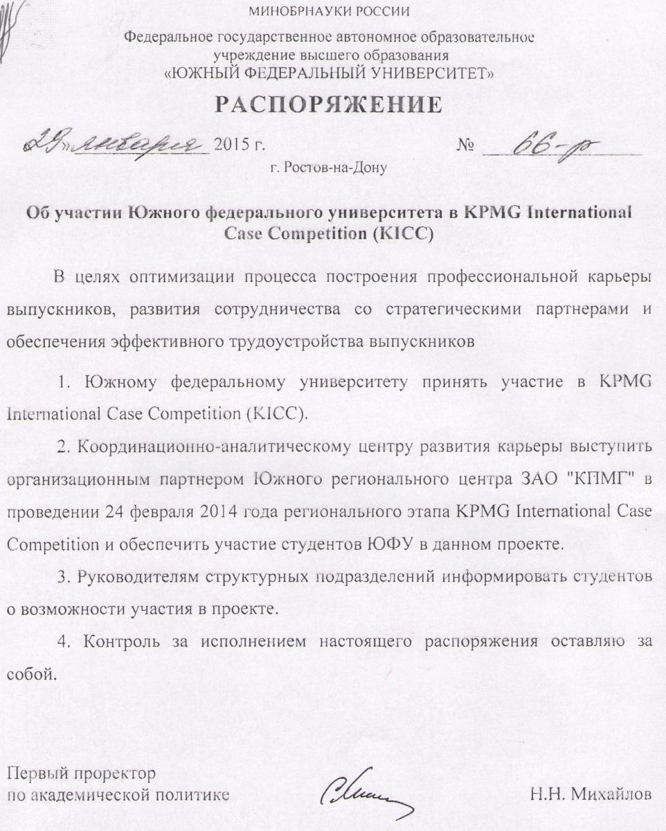 Распоряжение № 66-р Об участии Южного федерального университета в KPMG International Case Competition (KICC)